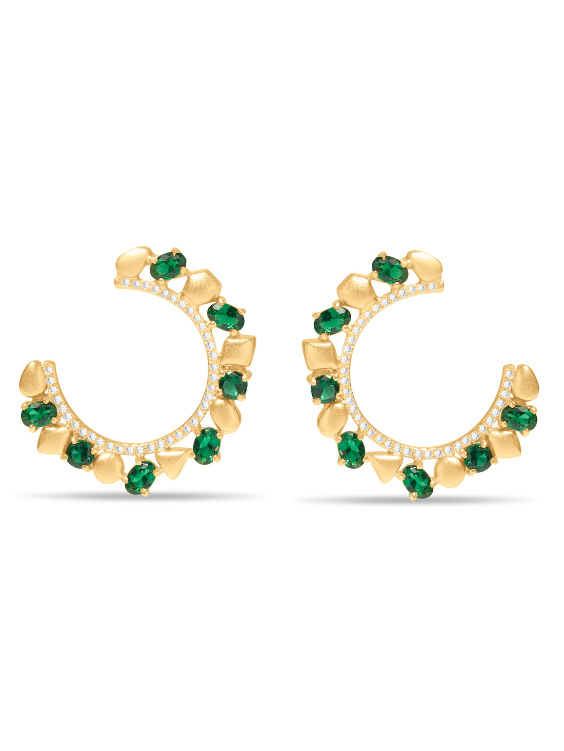 These enchanting pieces feature a half-circle design adorned with a captivating mix of green gemstones...