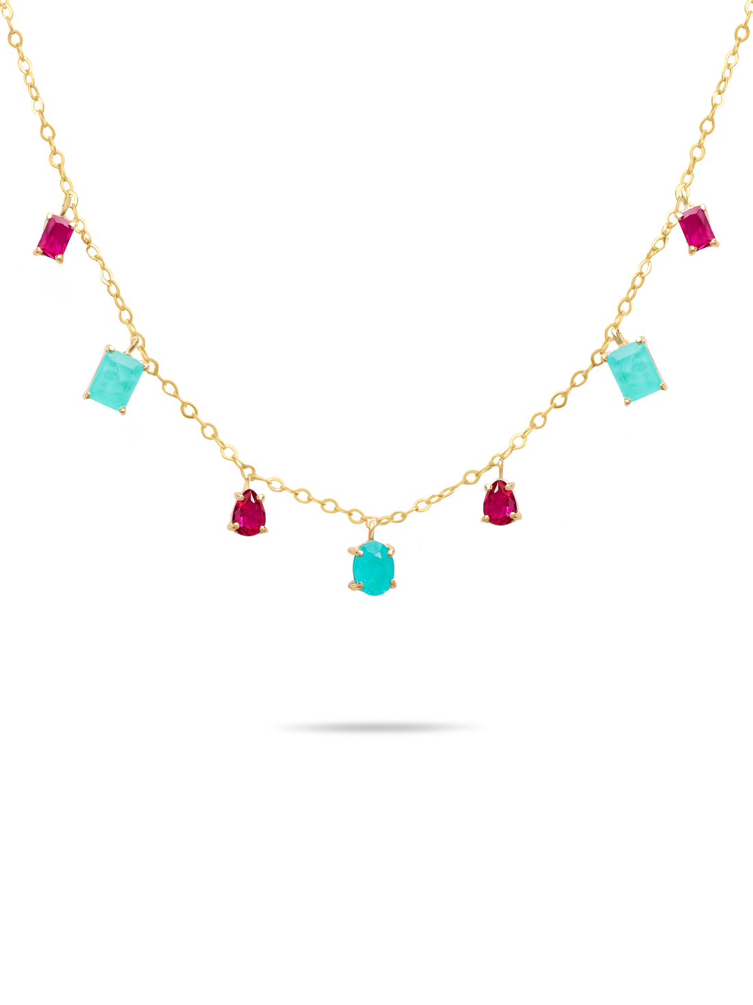 A tangle of treasures. Obsession is a vibrant dangling necklace featuring an array of mint...