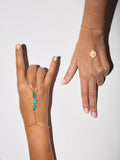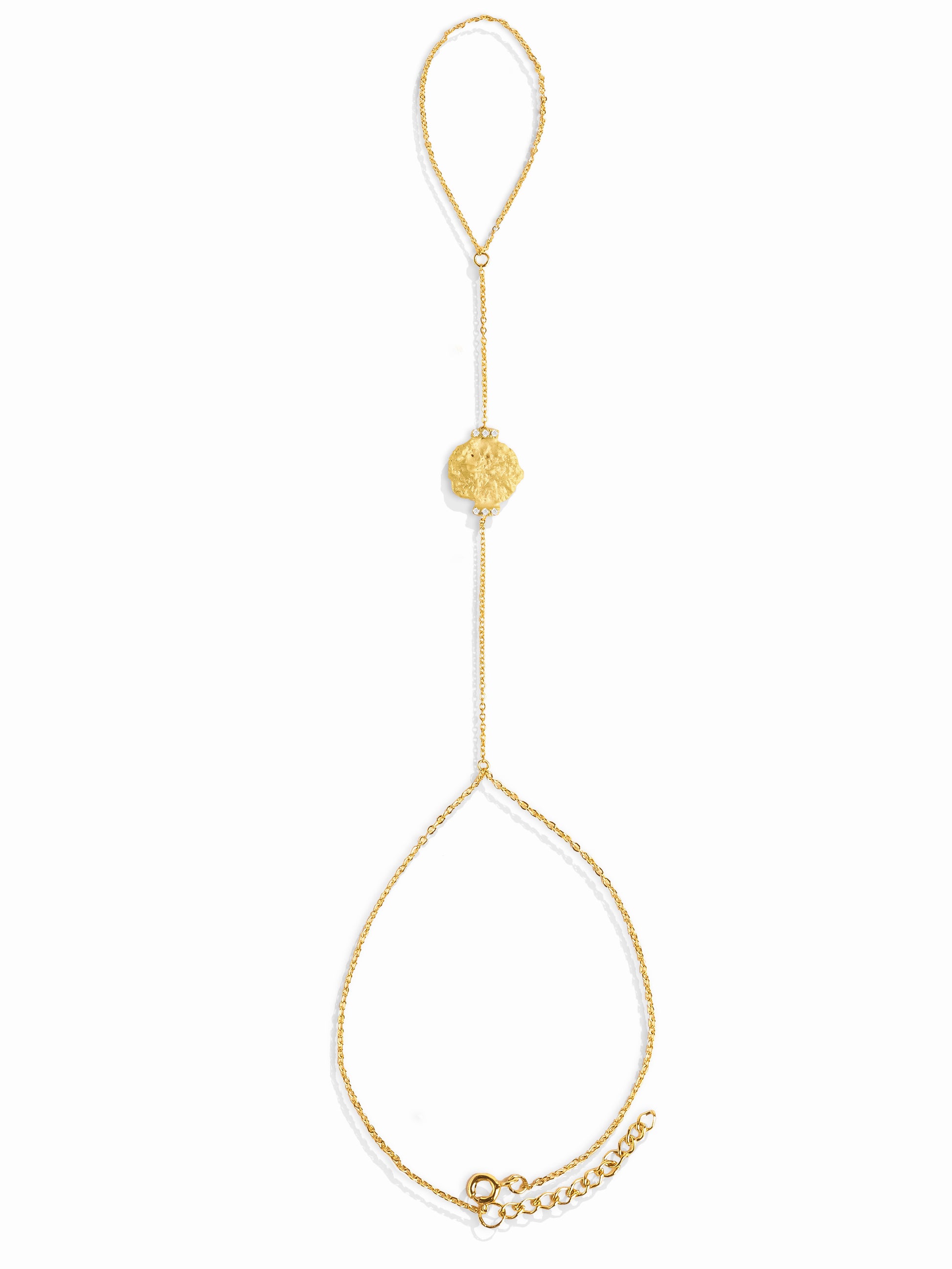 Inspired by the quiet strength of the desert, the Desert Glow Hand Chain features a single sculptural circle — raw, matte, and perfectly unrefined — resting at the center of the hand. Two delicate lines of zirconia trace above and below it, mirroring the horizon at dusk. The contrast between texture and light gives the piece a serene, effortless allure.
