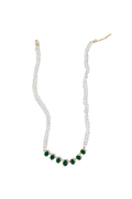 Evergreen Pearl Necklace: A pearl necklace crafted from natural creamy Pearls, centered with seven oval emerald-colored stones. Each gemstone is set in 925 Sterling Silver dipped in 18k gold, creating a refined contrast between the rich green tones and the soft luster of the pearls. Finished with a delicate gold clasp and extender, this piece balances classic pearl texture with a clean, structured gemstone centerpiece.