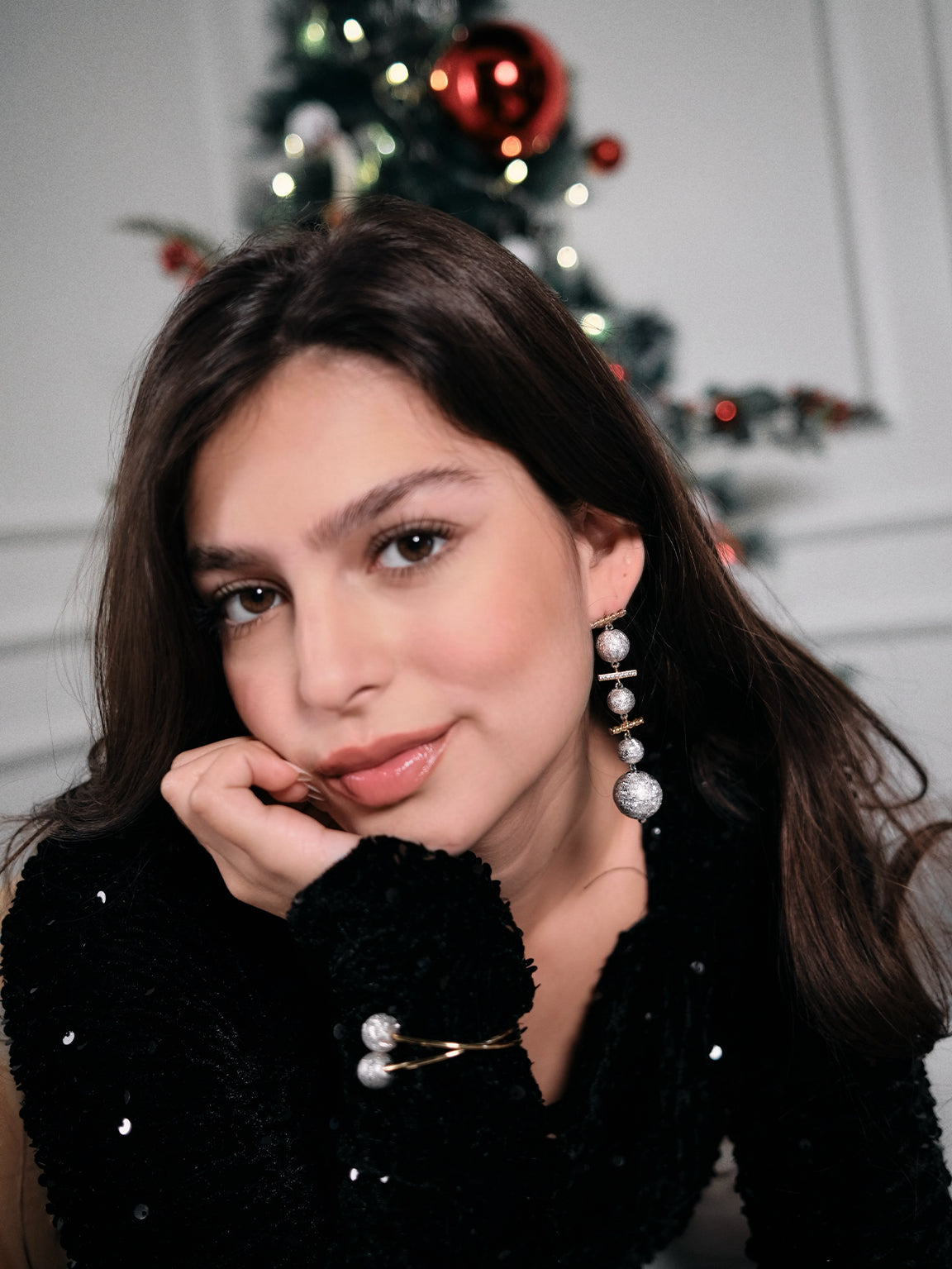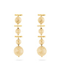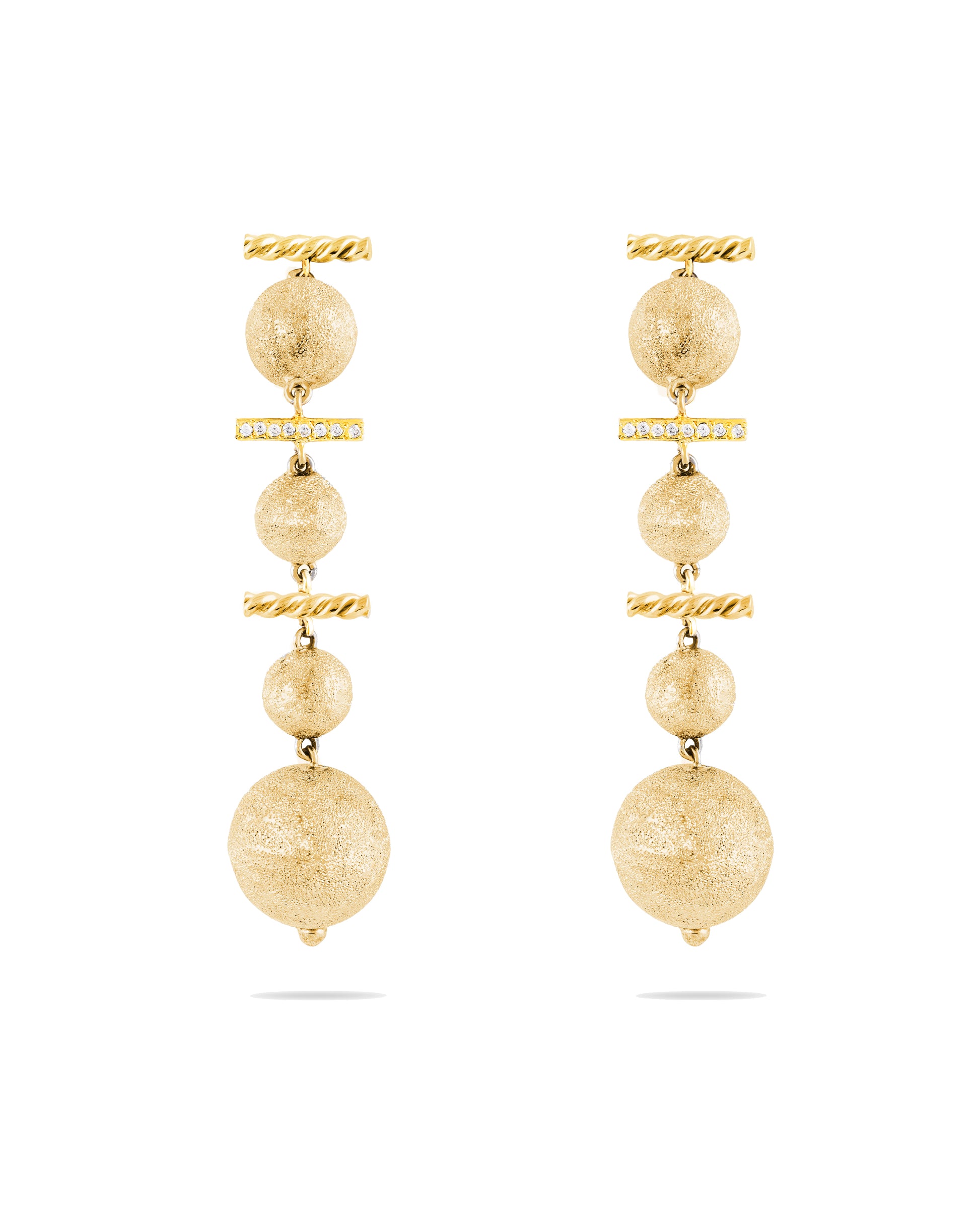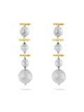 Frostlight Earrings: Statement drop earrings crafted from 925 sterling silver, designed in a vertical, articulated composition. The structure begins with a short braided bar dipped in 18k gold and Rhodium, followed by a medium-sized textured silver snowball. A horizontal zirconia bar set in 18k gold adds contrast and sparkle, leading into a smaller textured silver snowball. The design continues with another braided gold-dipped bar, a second small silver snowball, and finishes with a large textured silver snowball at the base. The grain-like snowball surfaces add shine and suspended elements create fluid movement.