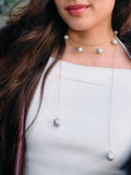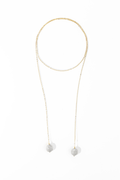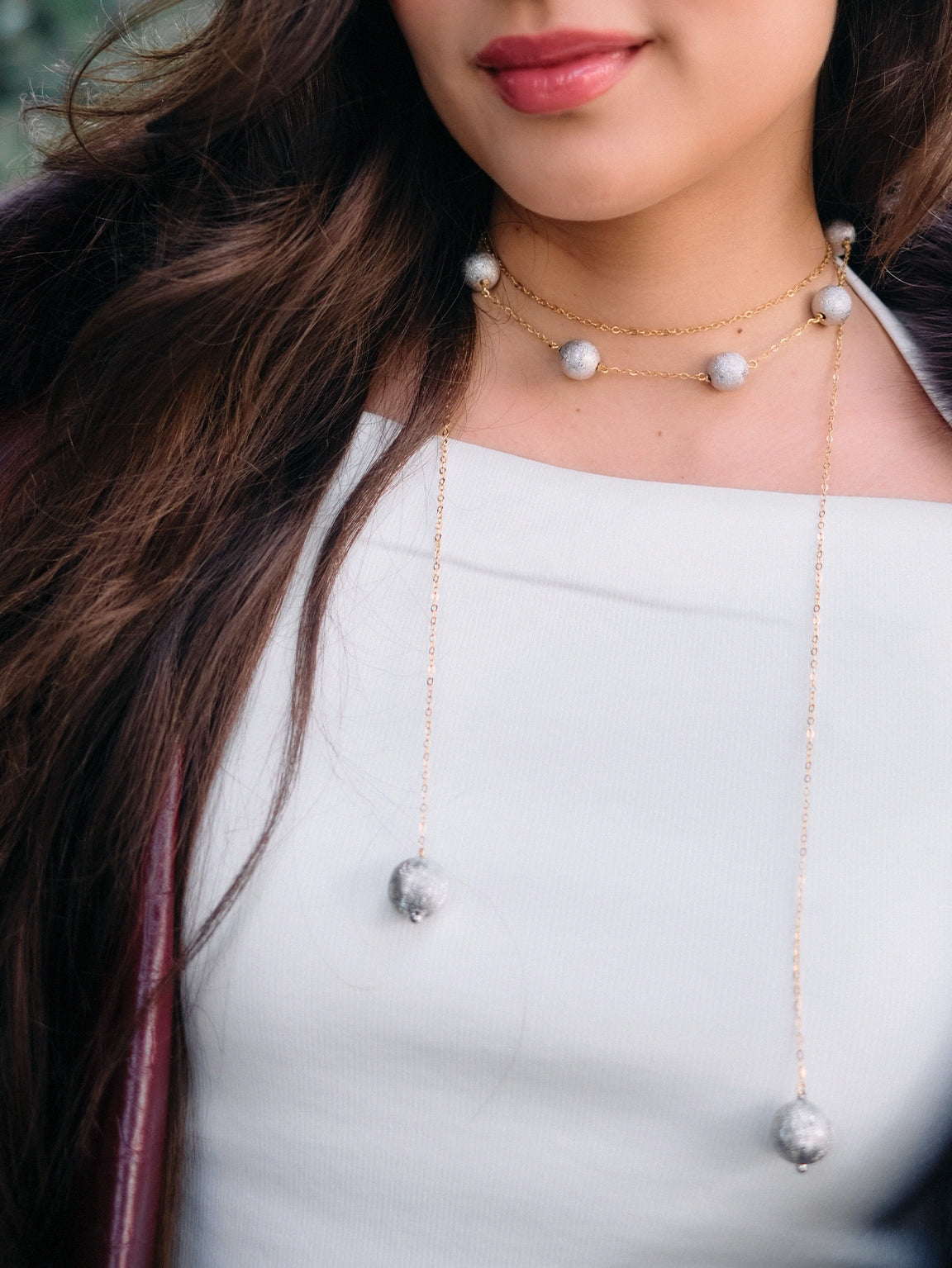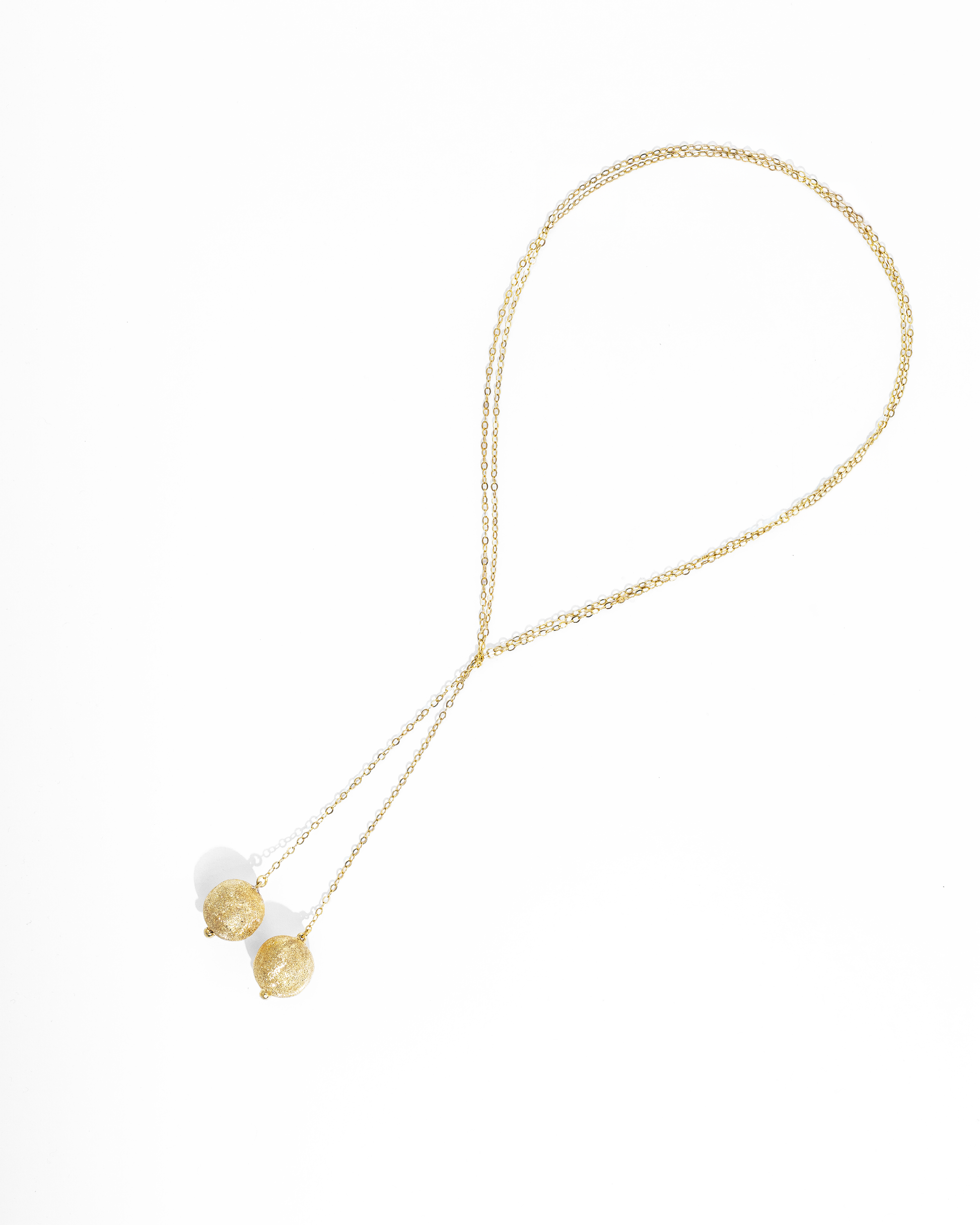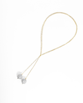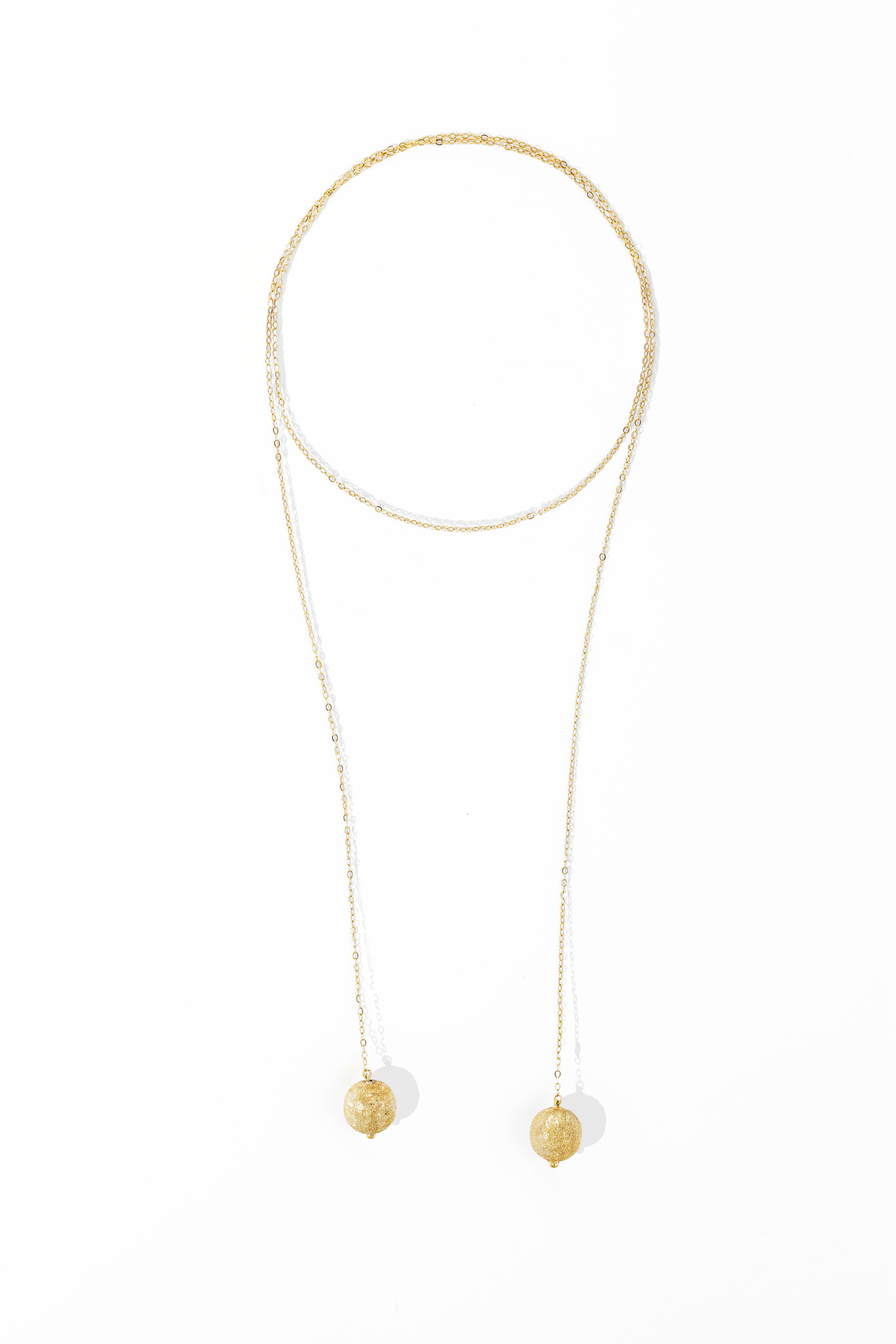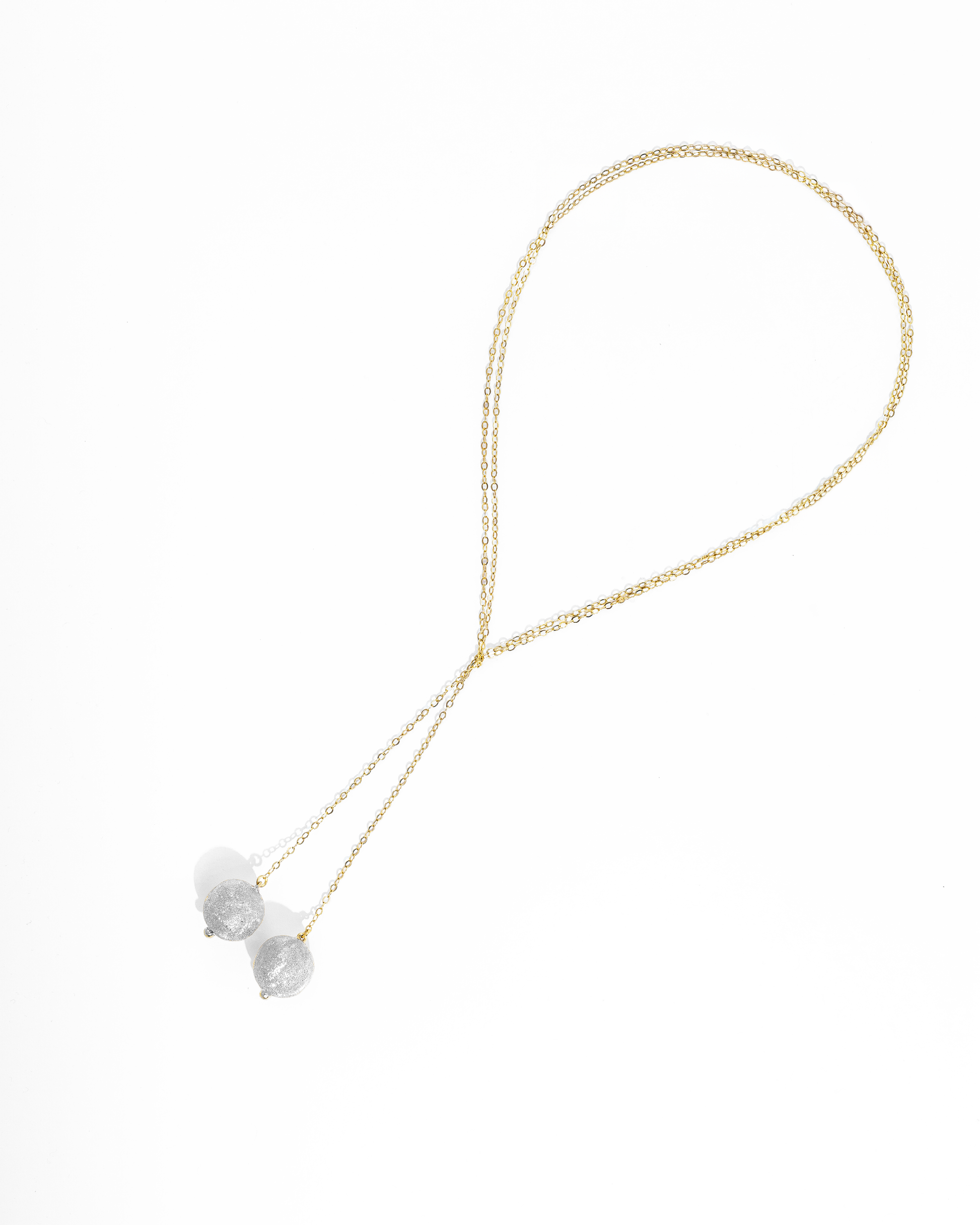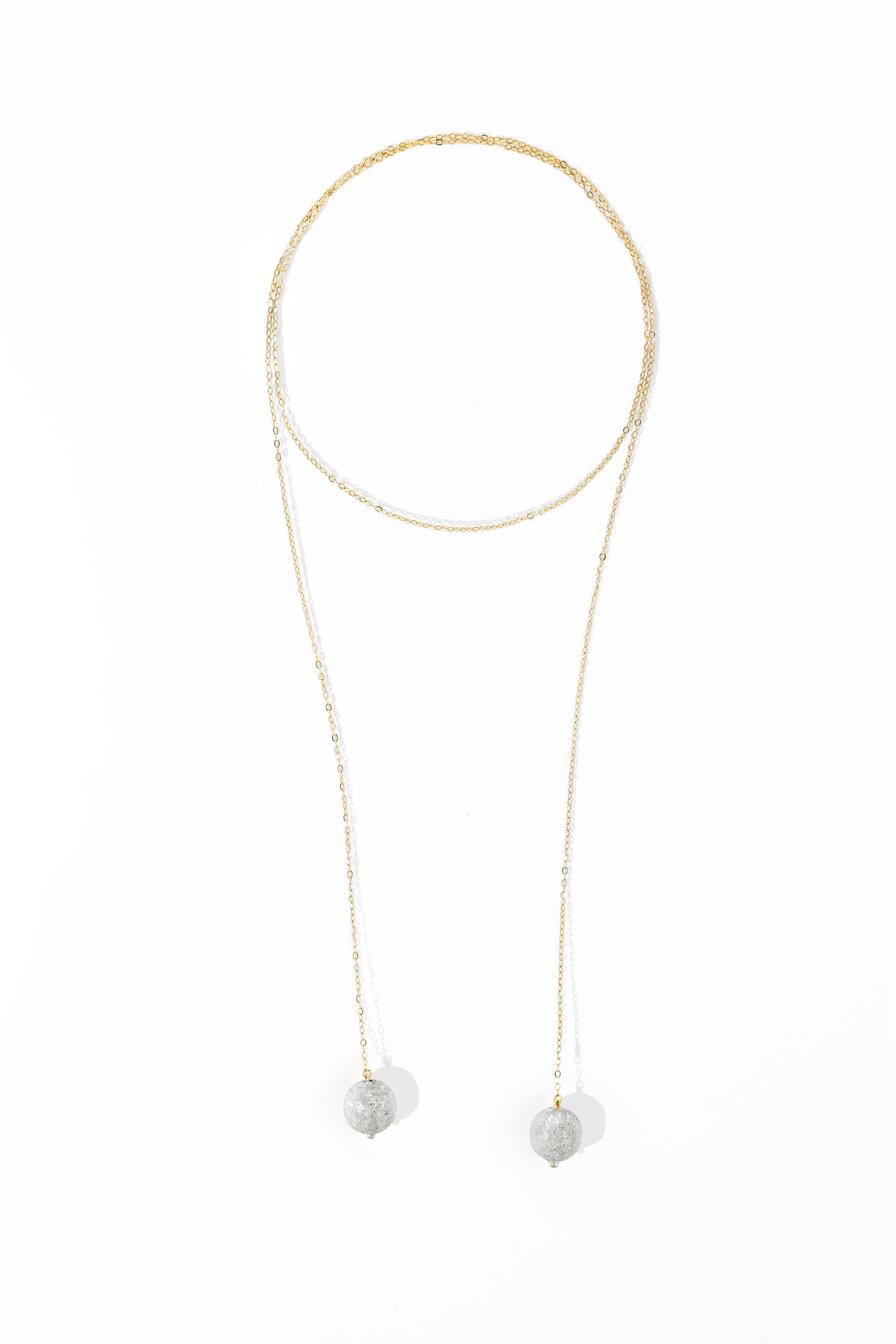 Snowfall Necklace: A long, versatile necklace crafted from 925 sterling silver and dipped in 18k Gold & Rhodium. The design is finished with two round snowball elements at each end, each featuring a textured, grain-like surface that adds soft sparkle and dimension. Its elongated silhouette allows for multiple styling options, from wrapping and layering to adjustable draping, making it a flexible piece that balances texture, shine, and movement.
