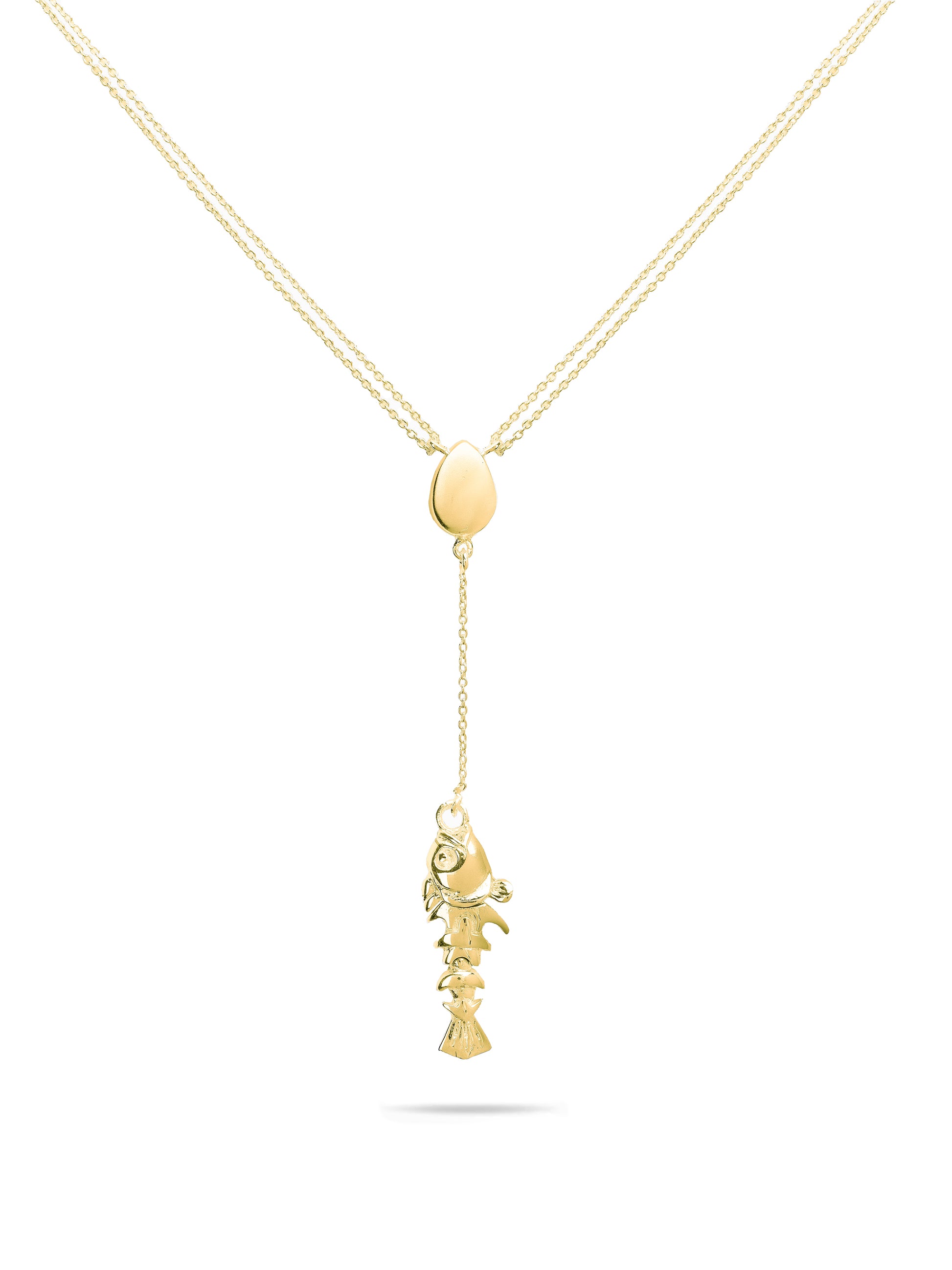 A story cast in silver. The catch is a drop necklace crafted from pure 925 Sterling Silver, featuring a bold pear-shaped emblem at the center. Dangling below, a finely 3D detailed fish charm with exaggerated textures adds a whimsical, oceanic touch—anchoring the piece in playful elegance.