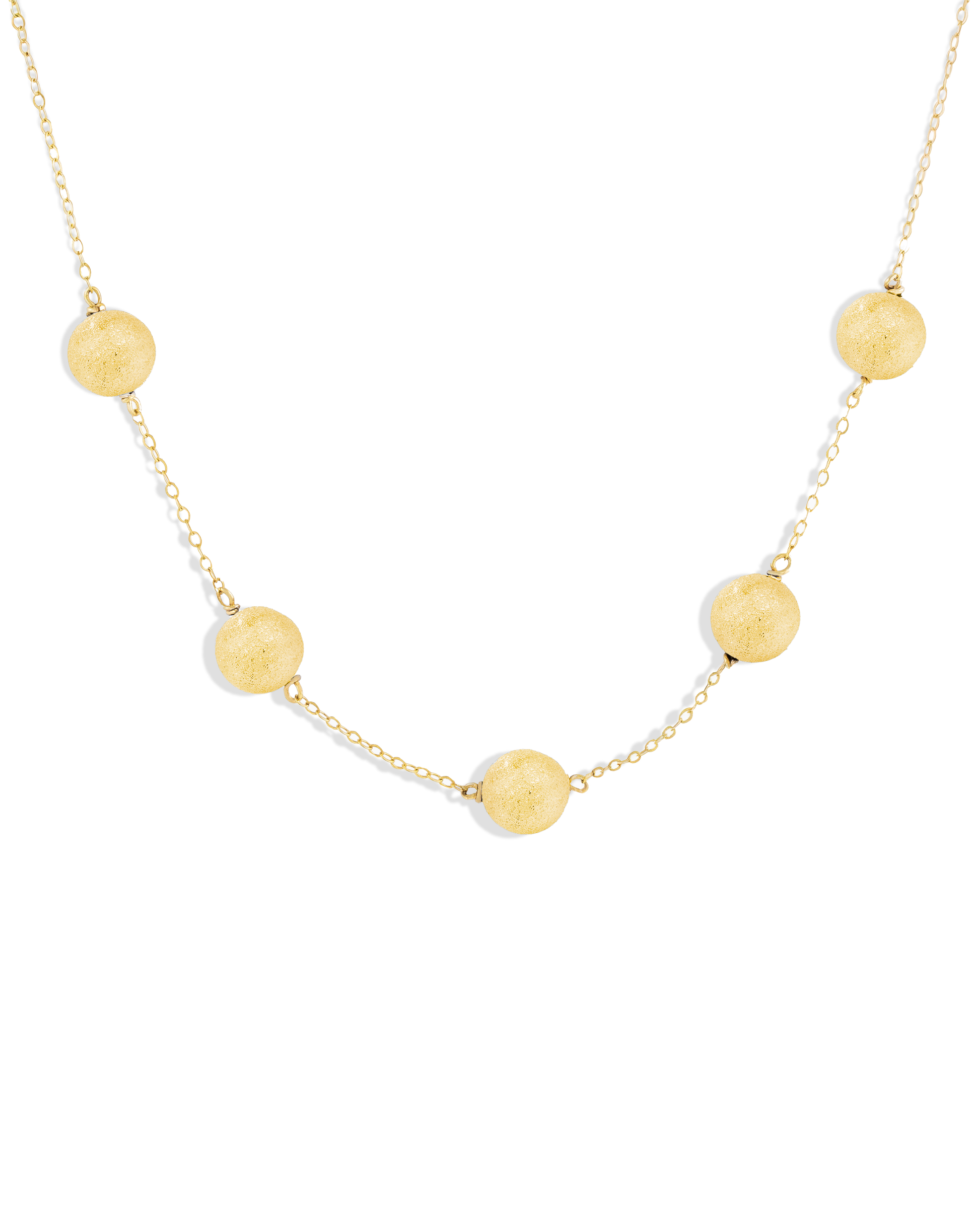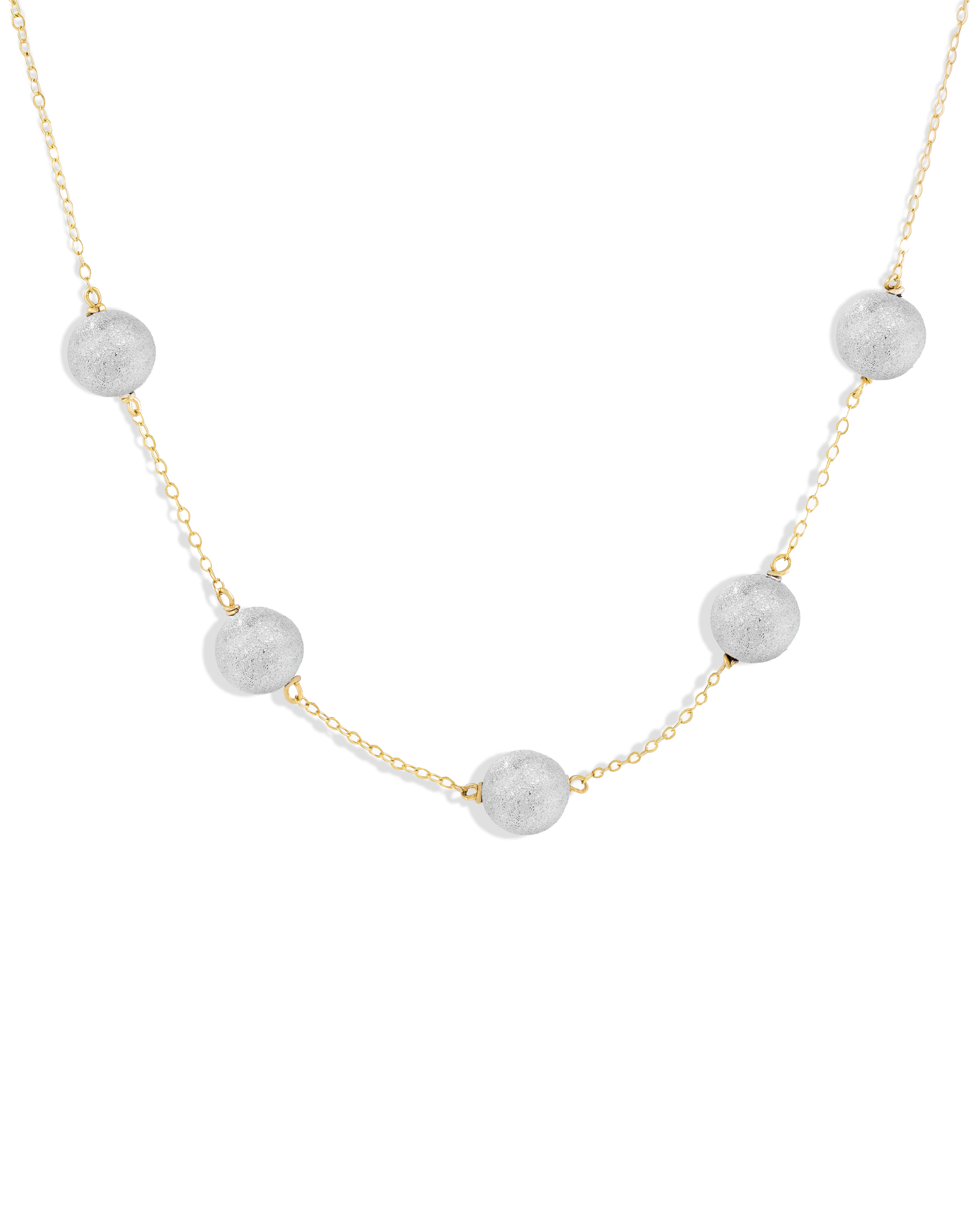 The Hostess Necklace: A necklace crafted from 925 sterling silver, featuring five textured silver snowball elements evenly spaced along the chain. Each snowball is plated in Rhodium, creating contrast against the 18k gold-dipped chain that connects them. Designed with balanced spacing, the snowballs sit centered along the necklace, allowing each textured sphere to stand out individually. Versatile in length and style, this piece can be worn alone as a statement or layered effortlessly with other necklaces.